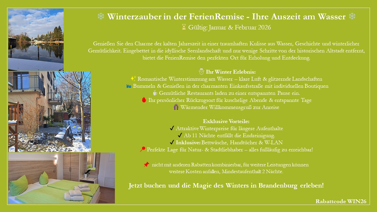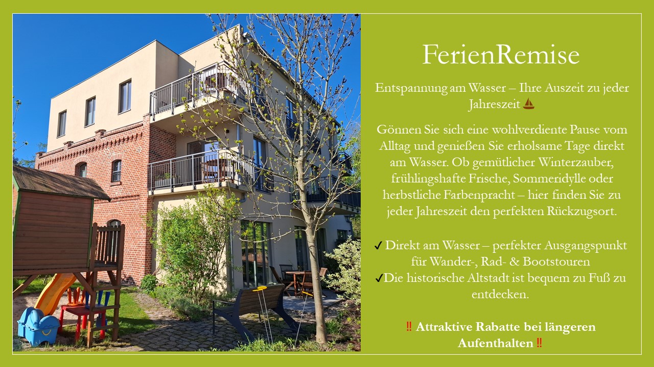 Die FerienRemise befindet sich in zentraler Lage mit direktem Wasserblick - perfekt, um die Stadt an der Havel mit ihren historisch sanierten Gebäuden fußläufig zu erkunden.