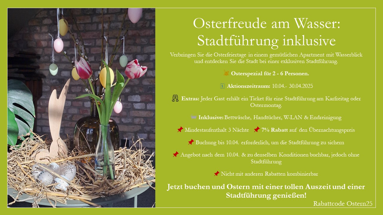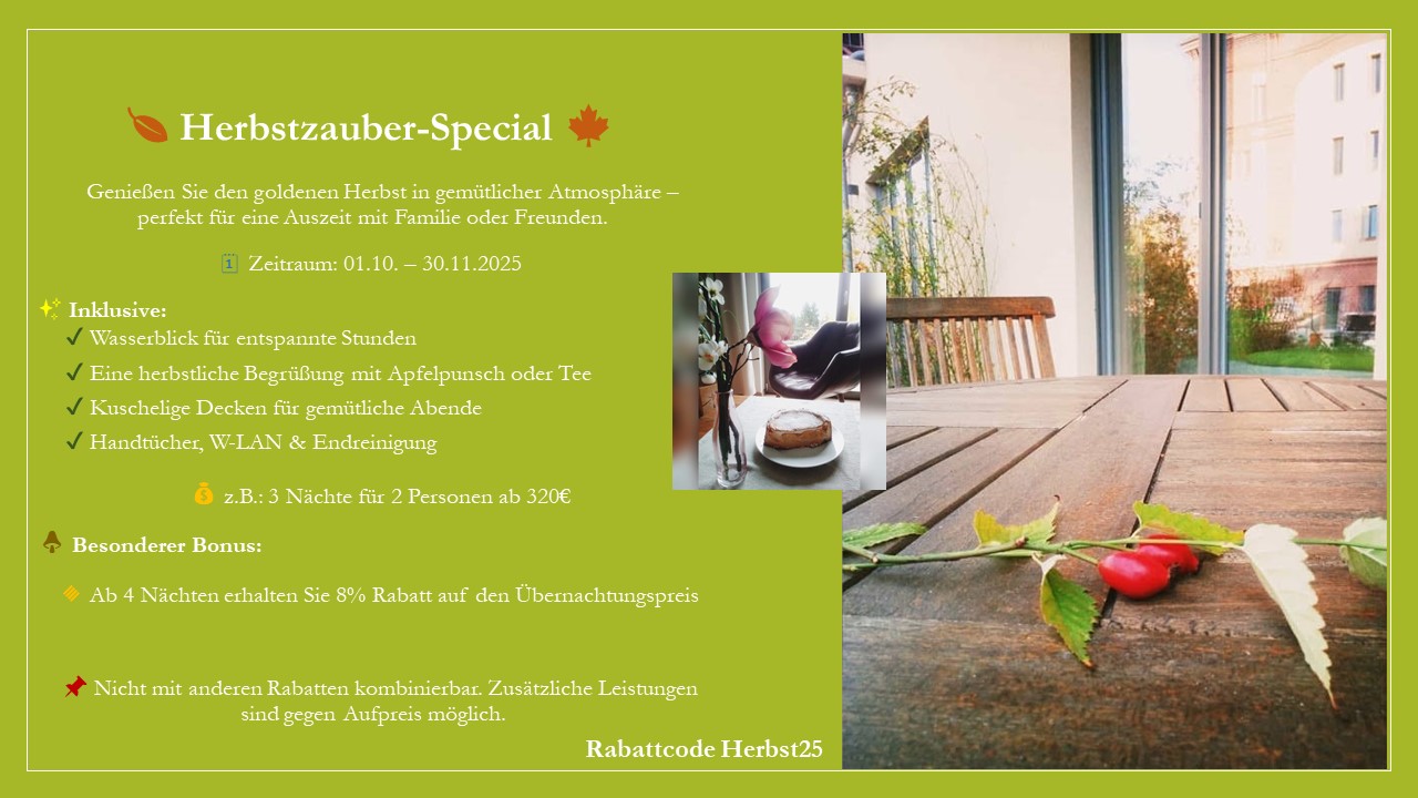 Als Direktbucher erhalten Sie 5% Rabatt auf Ihren Übernachtungspreis. Unsere sonstigen Buchungsbedingungen wie Mindestaufenthalt etc. gelten entsprechend. Kombinierbar (außer mit Rabattcodes, Pauschalen und Last Minute).